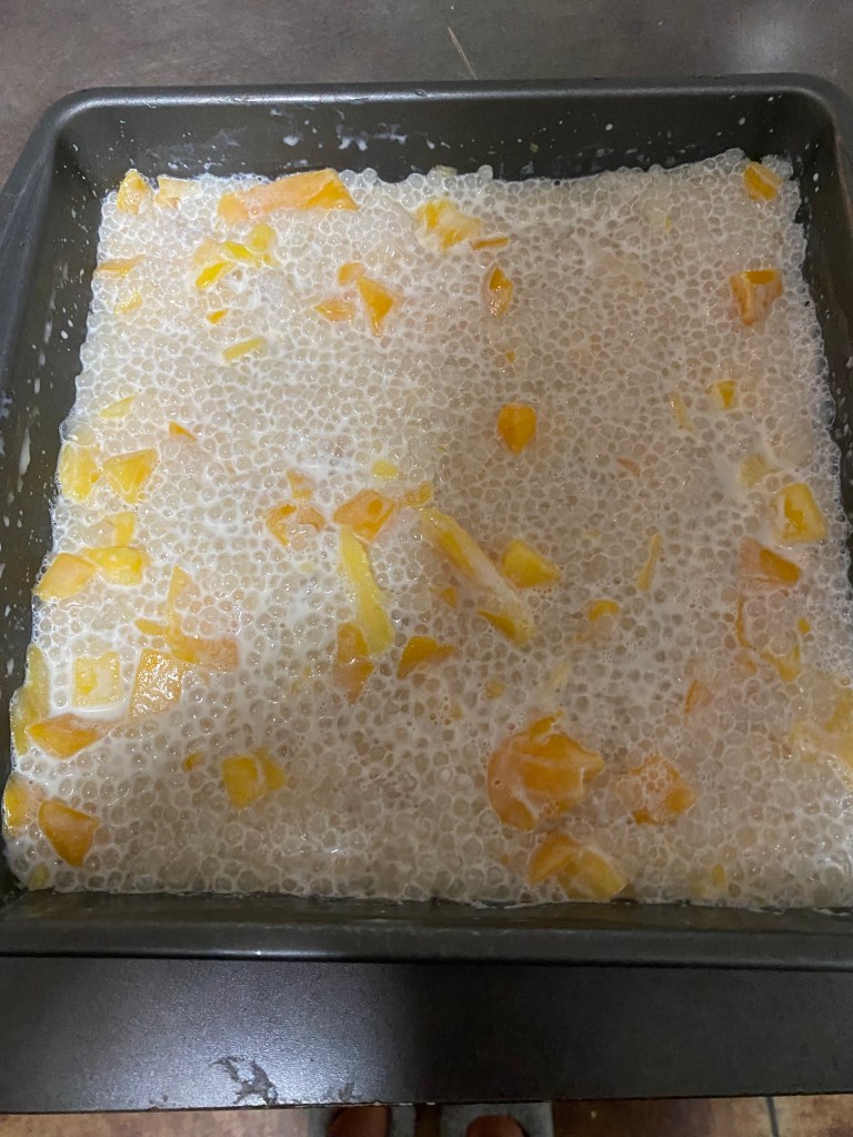 8. Once the pearls have cooled down, you can add the rest of the ingredients together, the milk mixture, tapioca pearls and mango and that’s all there is to it. You can keep any leftovers in the fridge for later as it will stay cool and is a nice treat to beat the summer heat.