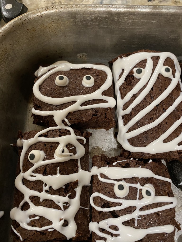 - Lastly, drizzle the rest of the icing to create the mummy wraps all over the brownies.